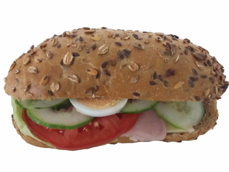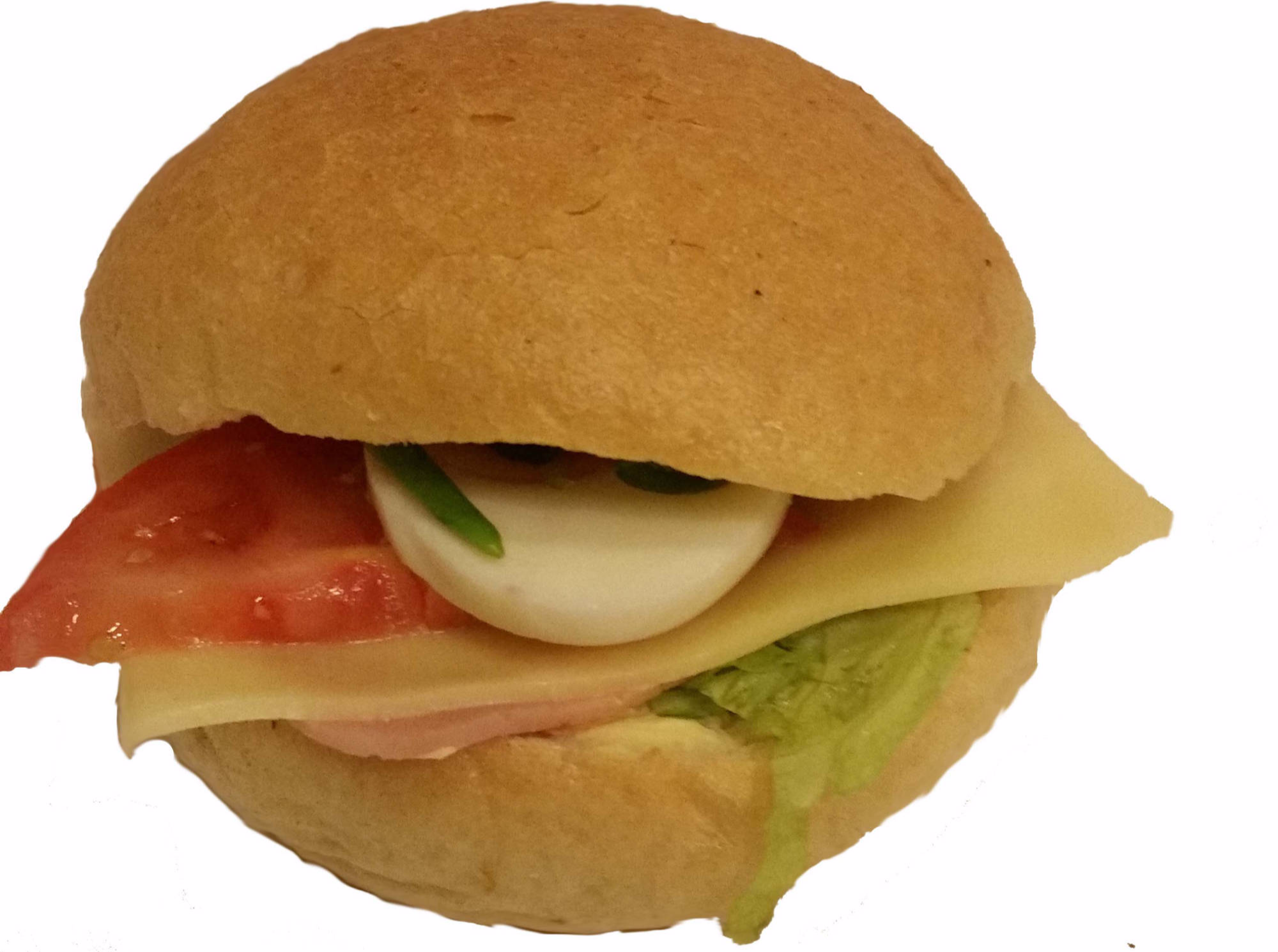 sałata lodowa, ser żółty, szynka, jajko, ogórek, pomidor, szczypior