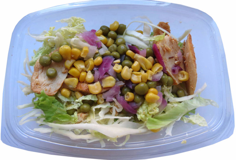 Skład: kapusta, kebab(kawałki mięsa z kurczaka), cebula, kukurydza konserwowa, groszek konserwowy, ketchup, sos czosnkowy