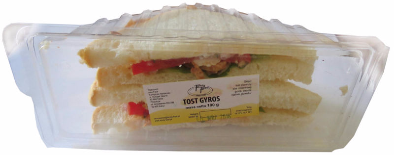 Skład: tost pszenny, sos czosnkowy, gyros, cebula, ogórek, pomidor